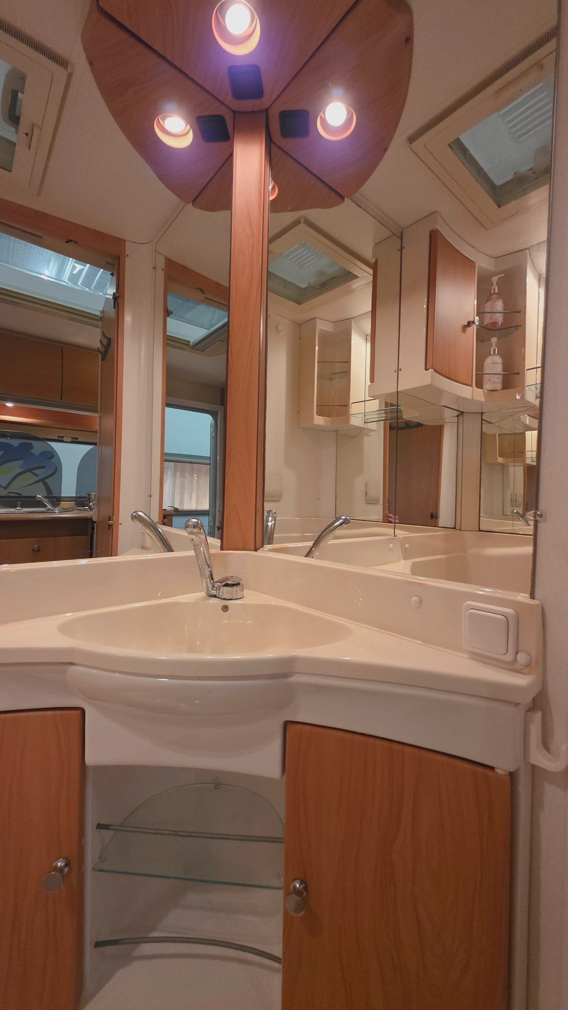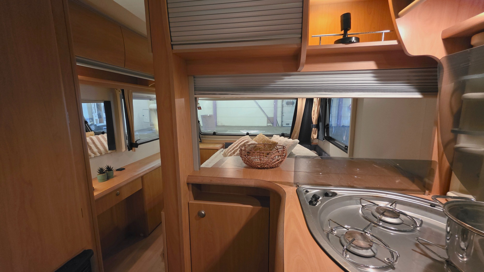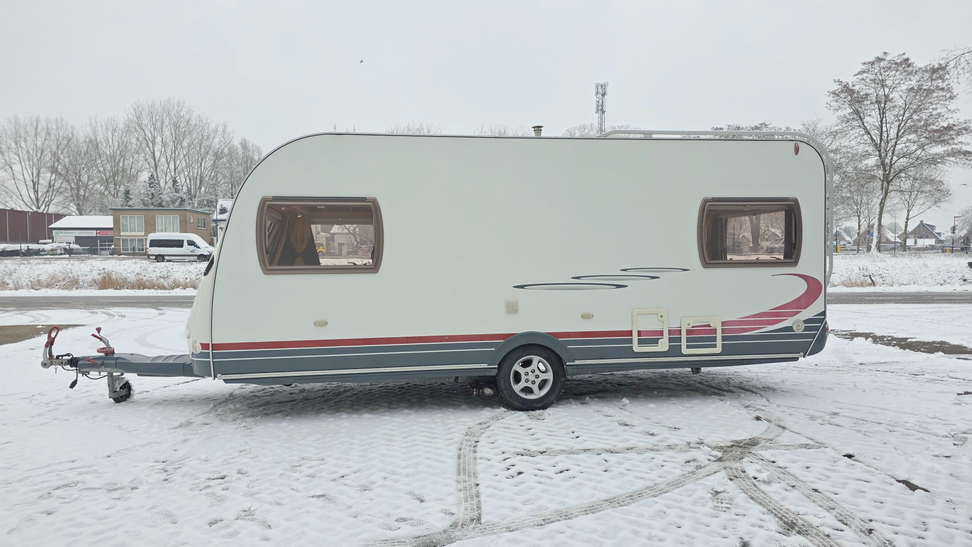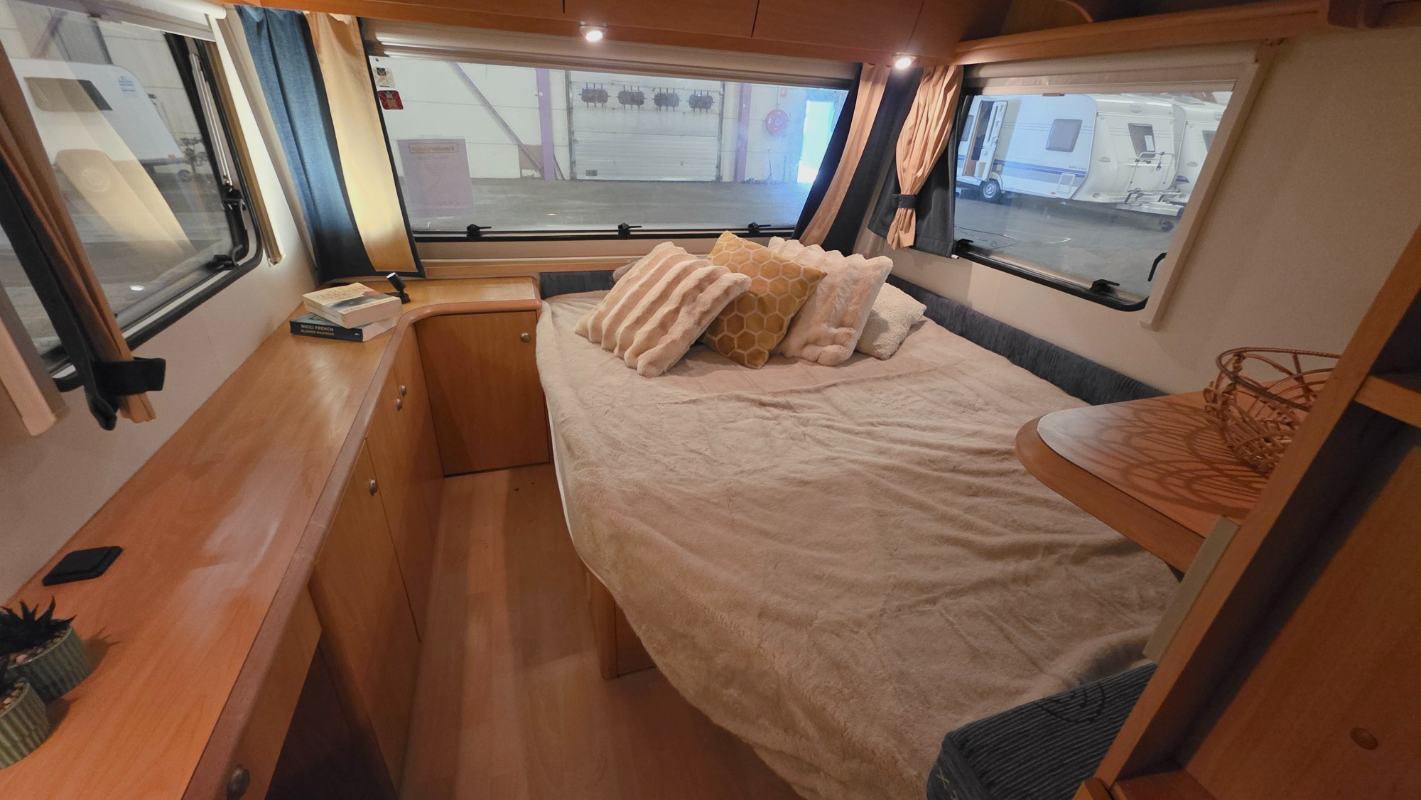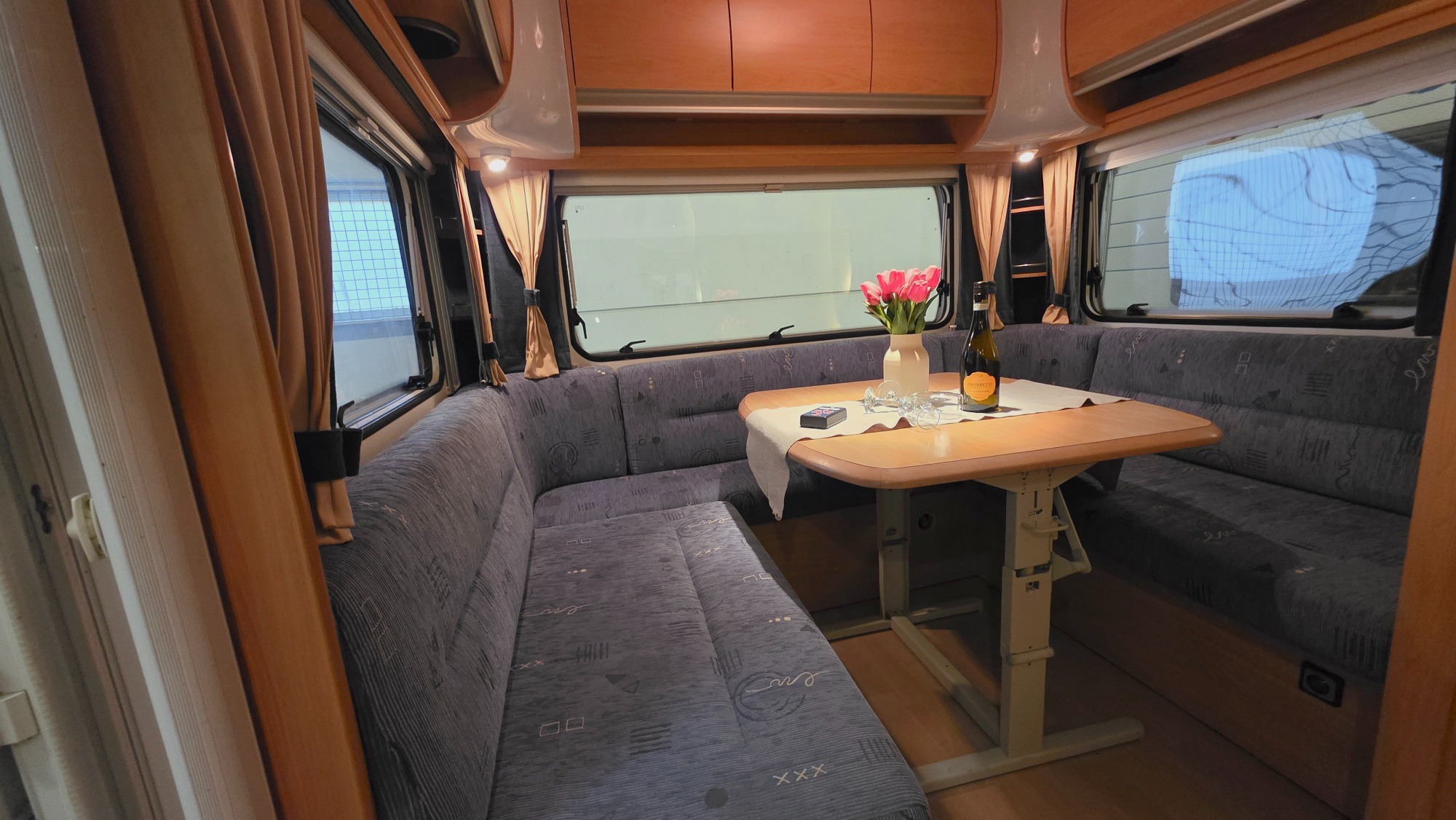 Goed onderhouden caravan met veel praktische voorzieningen en een slimme indeling. Uitgerust met een frans bed voorin en een rondzit die eenvoudig is om te bouwen tot een 2‑persoons bed, ideaal voor gezinnen of logees.